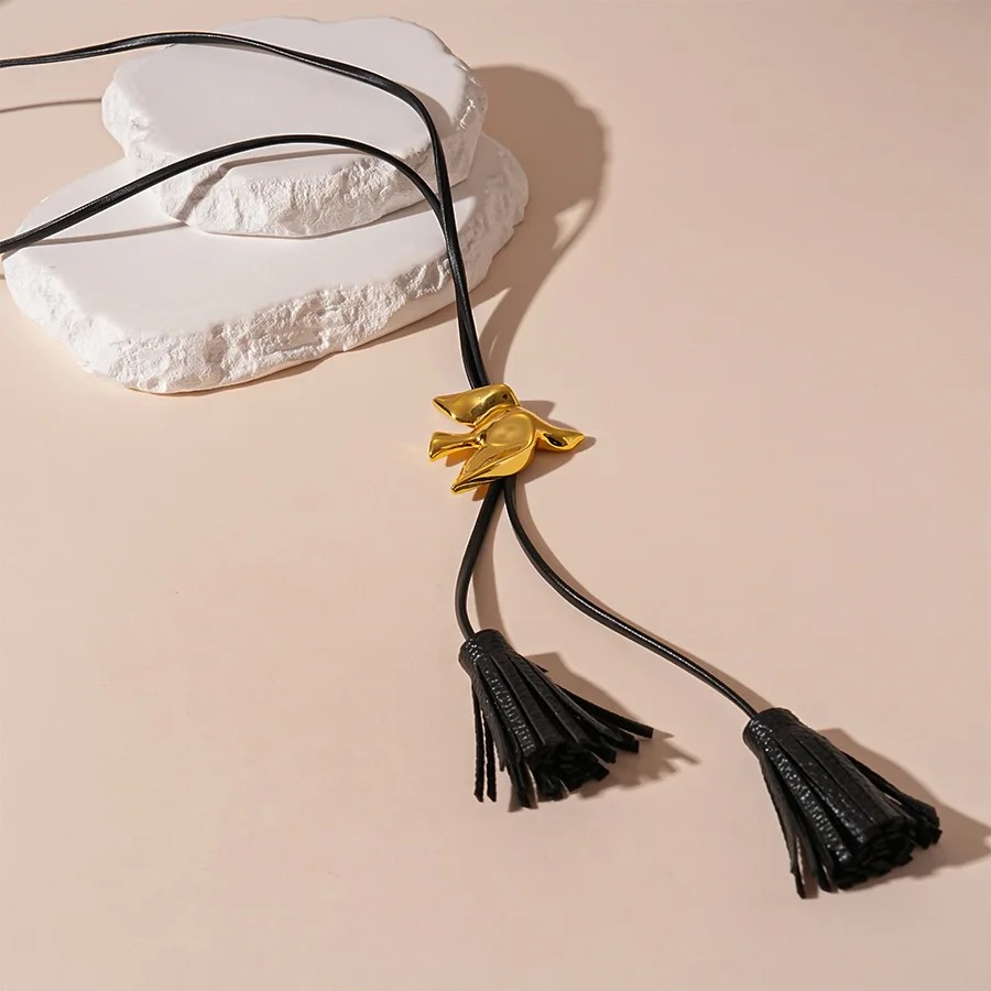 Colier statement tip cravata bolo cu pandantiv în formă de porumbel și ciucurasi negri, design lung și modern, accesoriu elegant pentru ținute casual sau de seară, aliaj metalic si piele ecologica, Gold