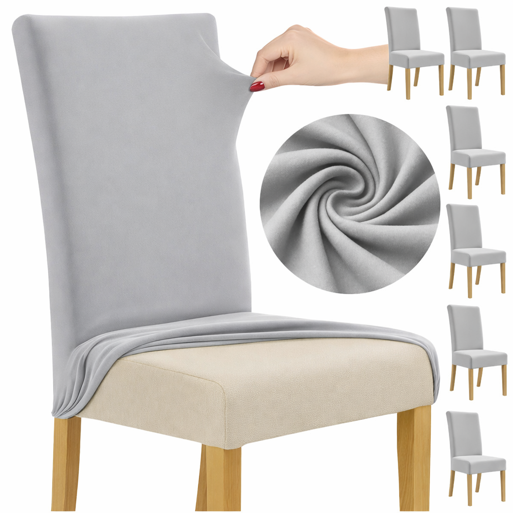 Set 6 huse protectie scaun, marime universala, pentru scaune de bucatarie, birou, casa, restaurant, evenimente, material polyester si spandex catifelat, lavabile, banda elastica pentru fixare si antialunecare, 65 x 40 x 35 cm, Gri Deschis