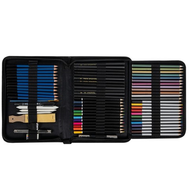 72 ELEMENTE – setul are o selecție foarte mare de elemente destinate schiței, desenului sau picturii etc. Alegeți dintre creioane de o moliciune diferită, creioane colorate, pandantive și multe alte instrumente utile de scris in timpul lucrului.